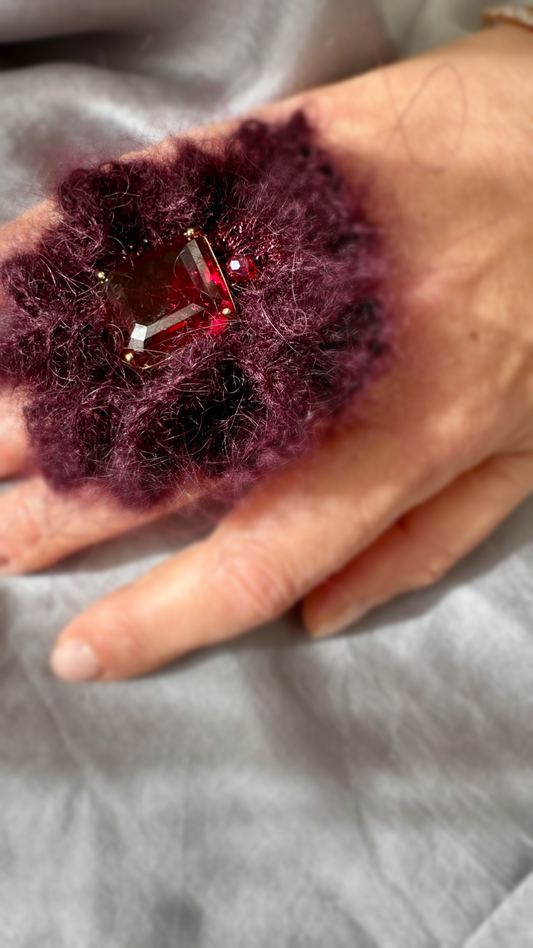 Silk Mohair Artistic Ring in Burgundy with Statement Crystal