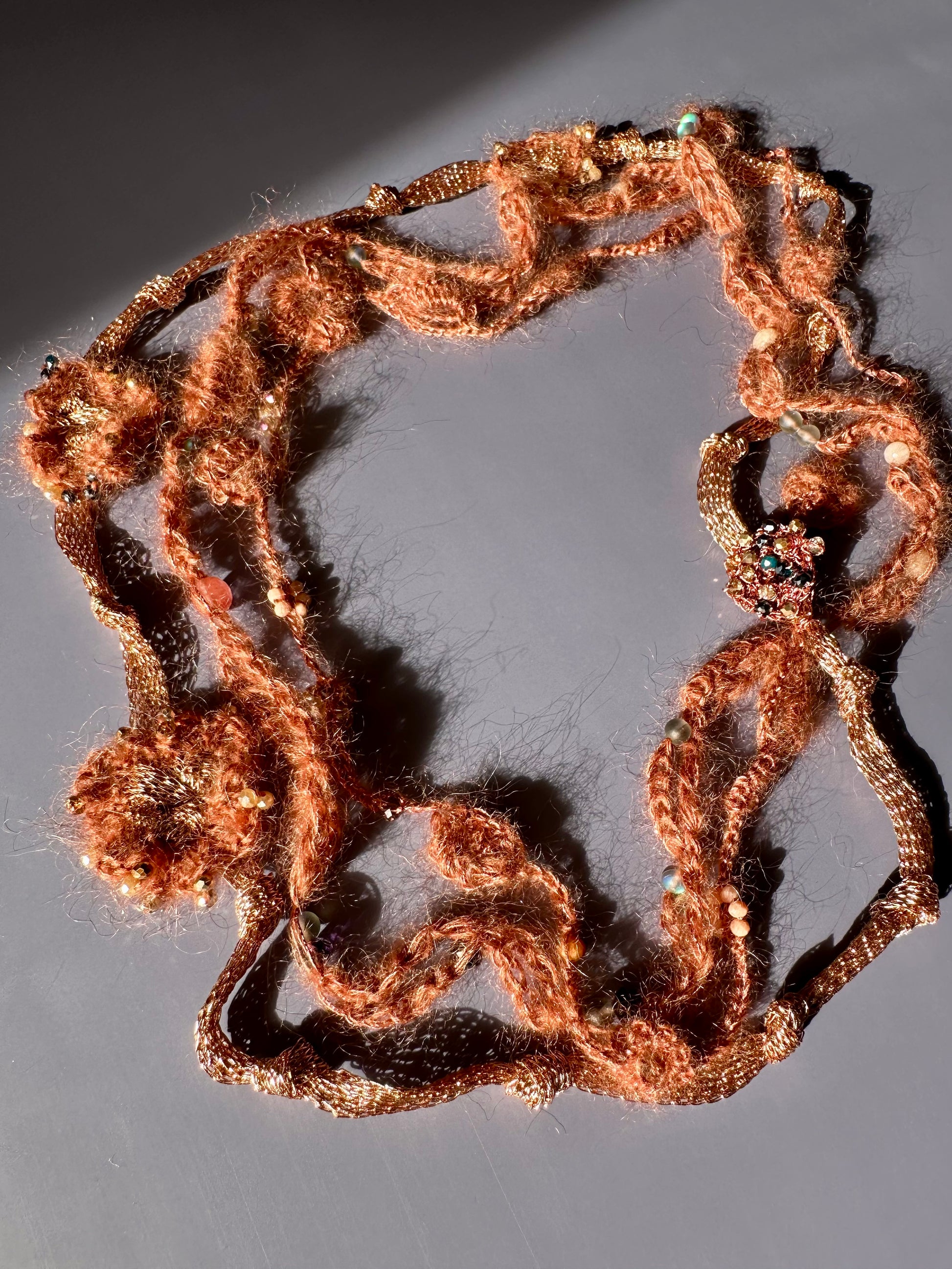 As the seasons shift and the air grows crisp, the Autumn Glow Necklace brings warmth and texture to your style. Hand-knitted with soft mohair in earthy copper tones, it intertwines with golden threads, beads, and delicate details for a layered, cozy elegance.