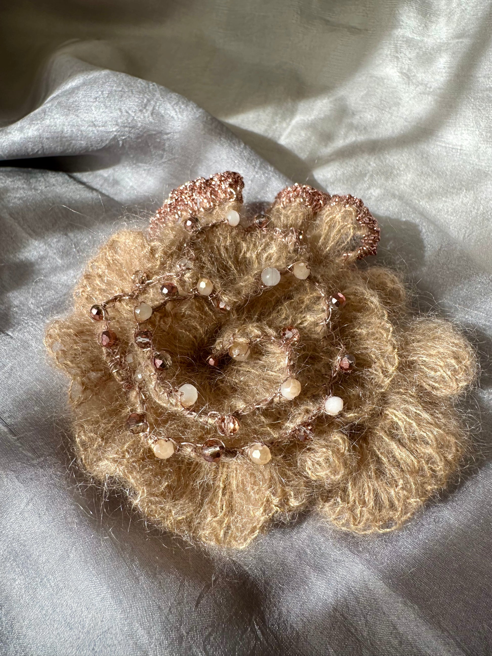 Extra soft silk-mohair with rose gold micro jewelry yarn, glass crystals and stainless steel pin on the back. Soft beige. Around 11 cm wide.