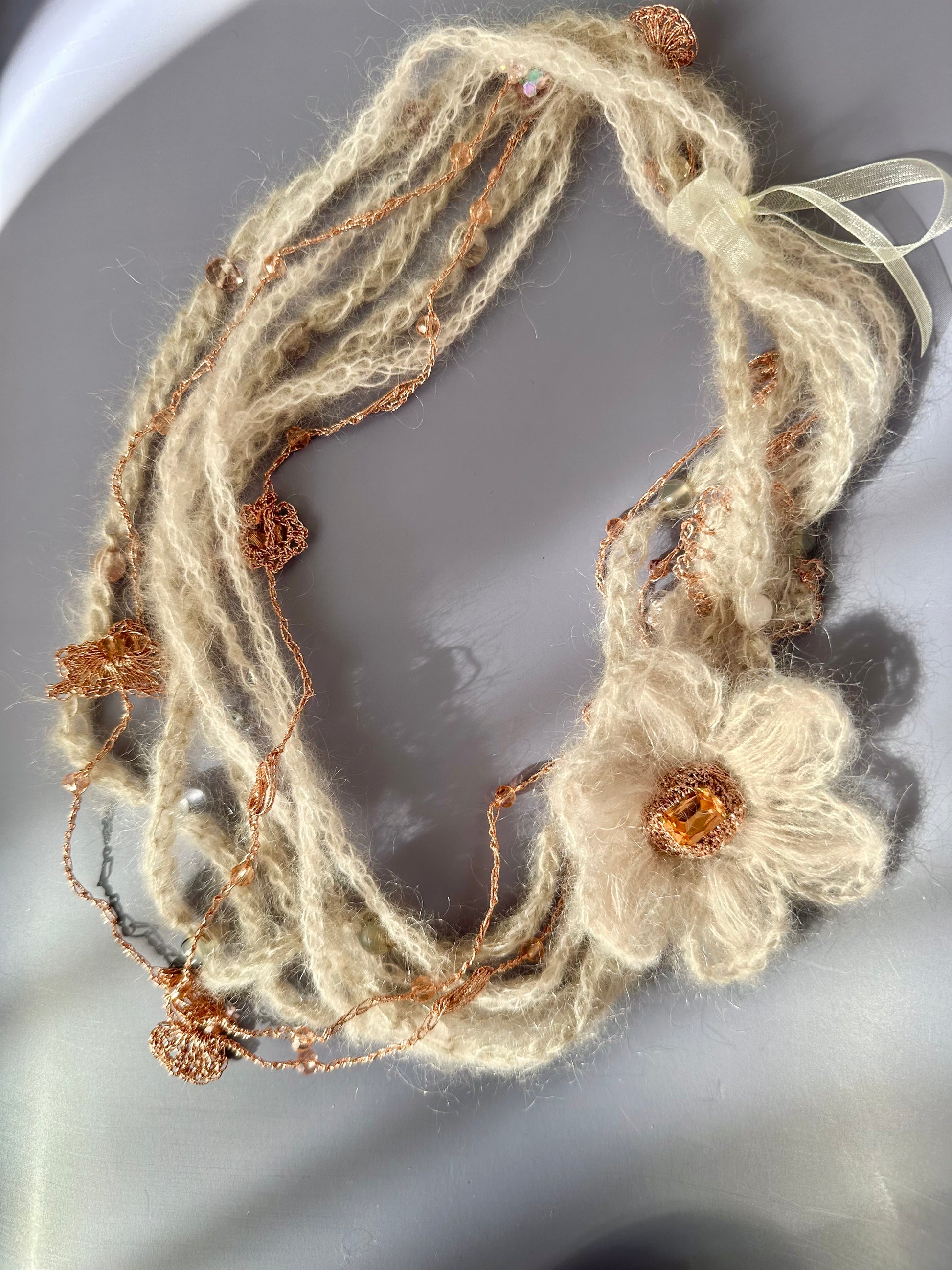 Mohair, silk, rose gold yarn and glass crystals. Soft pinkish white mohair and rose gold micro yarn.