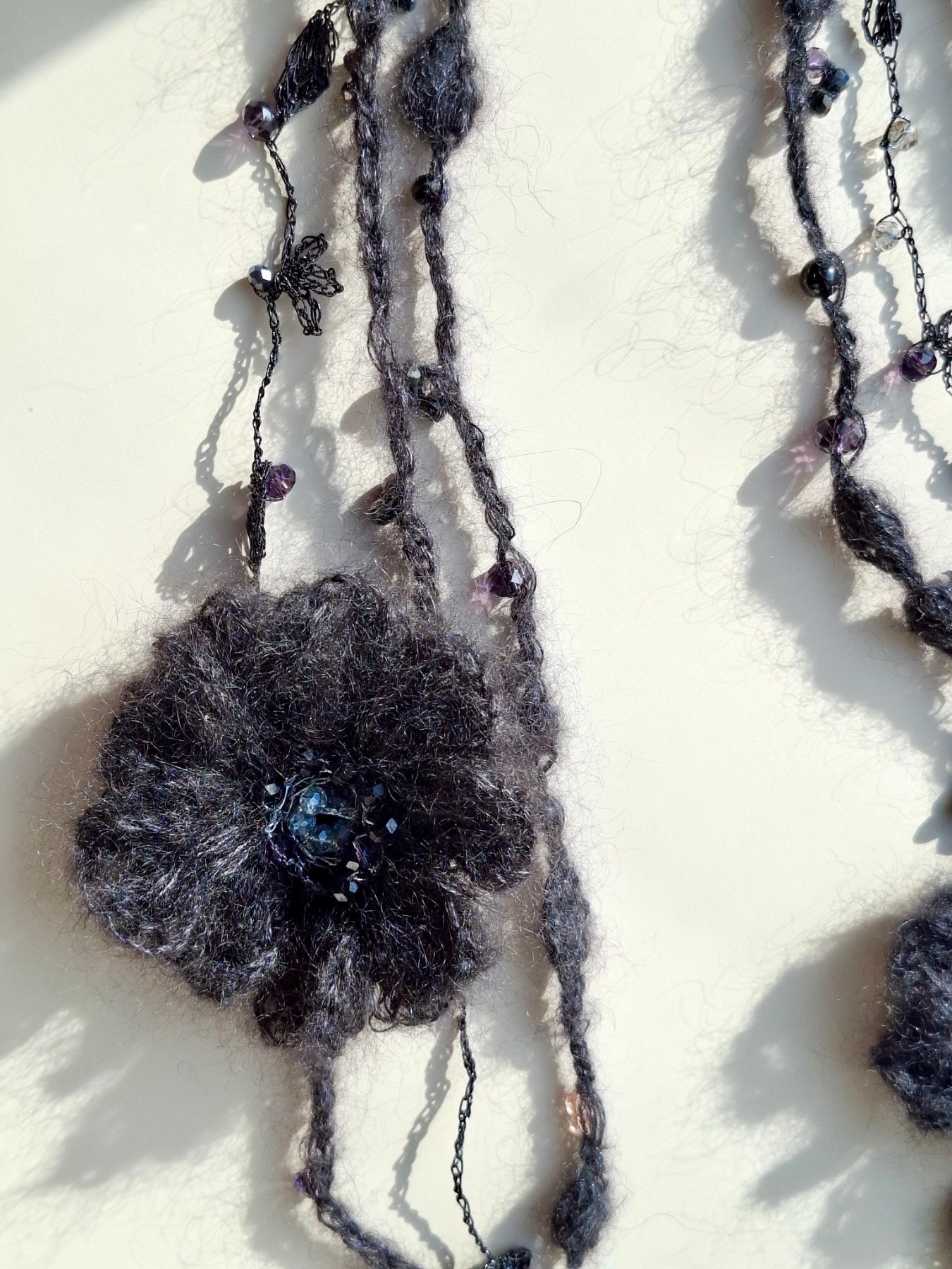 A versatile necklace composed of three separate hand-knitted strands, with soft mohair flowers attached to different strands. This design allows multiple ways of wearing and styling, from layered and playful to elegant and minimal.