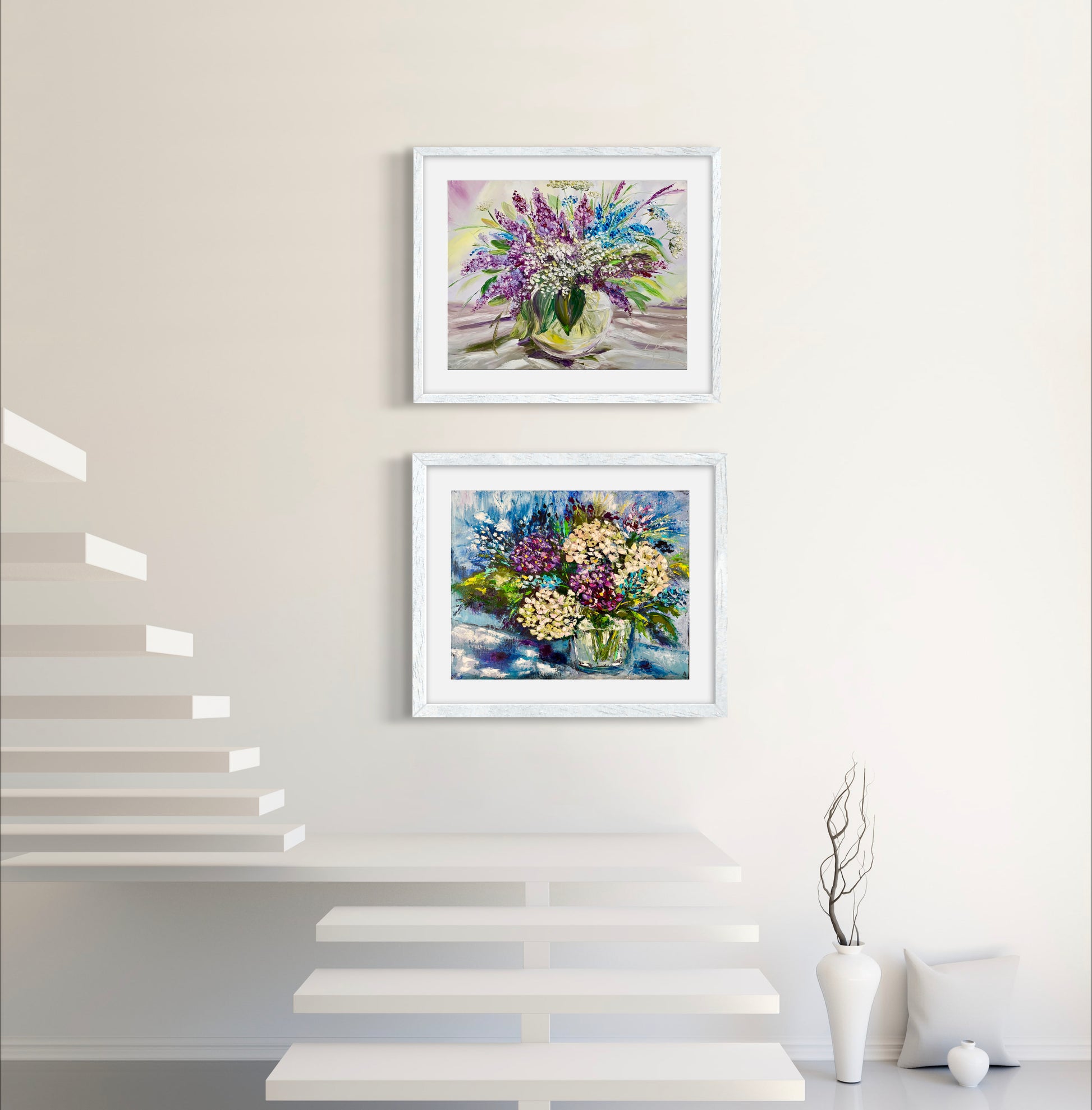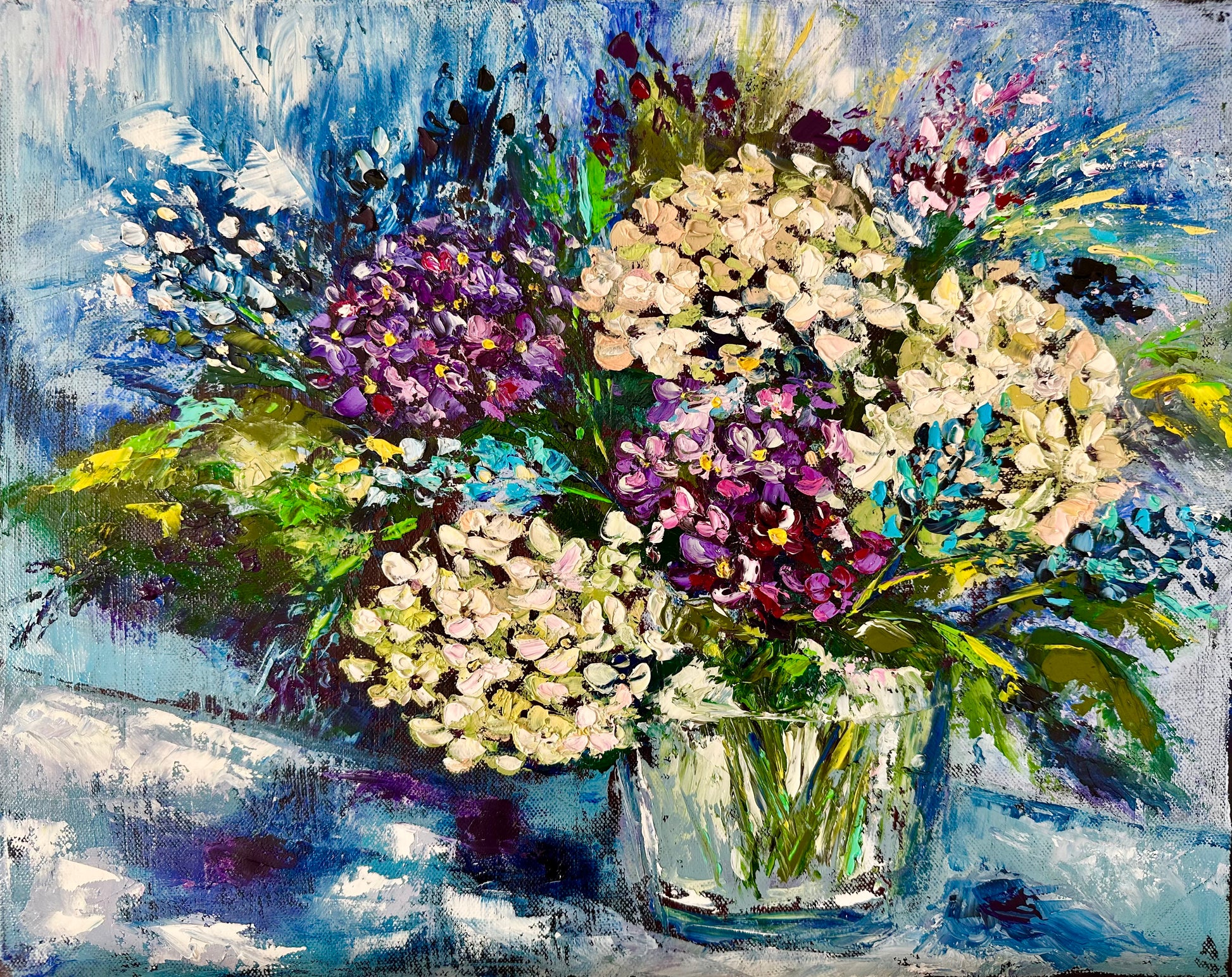 Painted with oils using a palette knife on canvas, this piece brings together five hydrangeas in a vase, interpreted through a modern, expressive lens of realism. The strokes are textured, the colors bold yet delicate, and the composition alive with movement and joy.