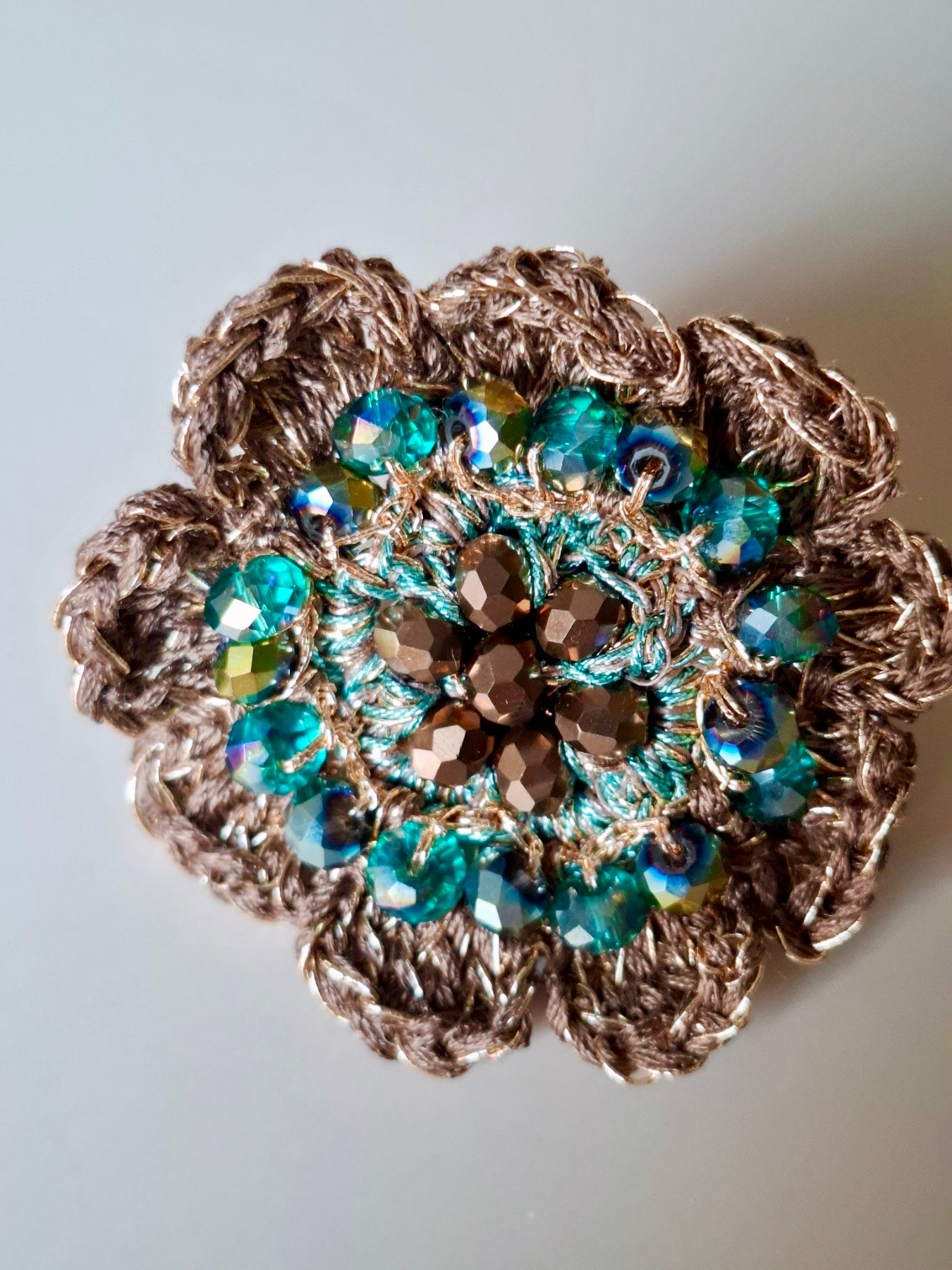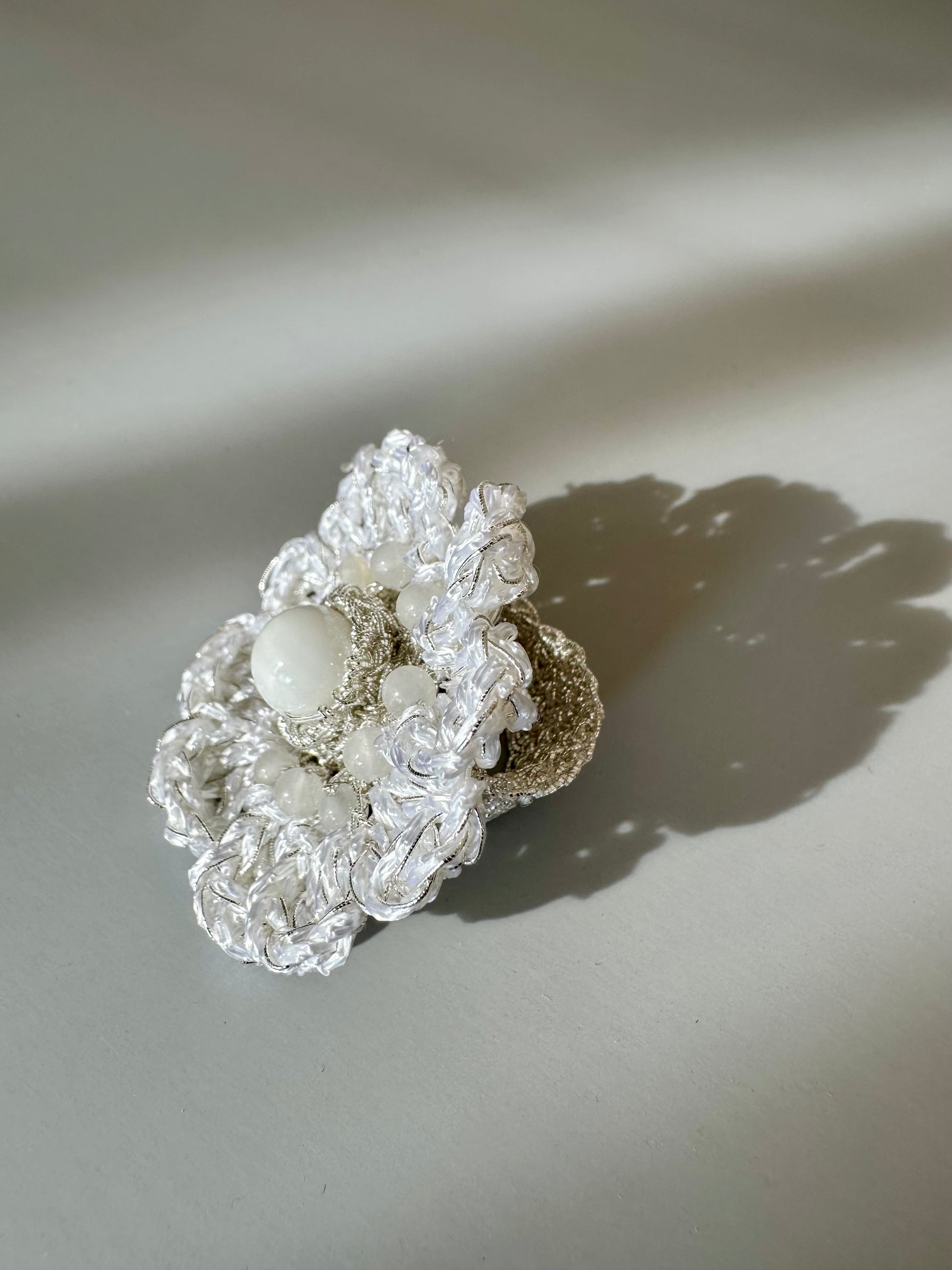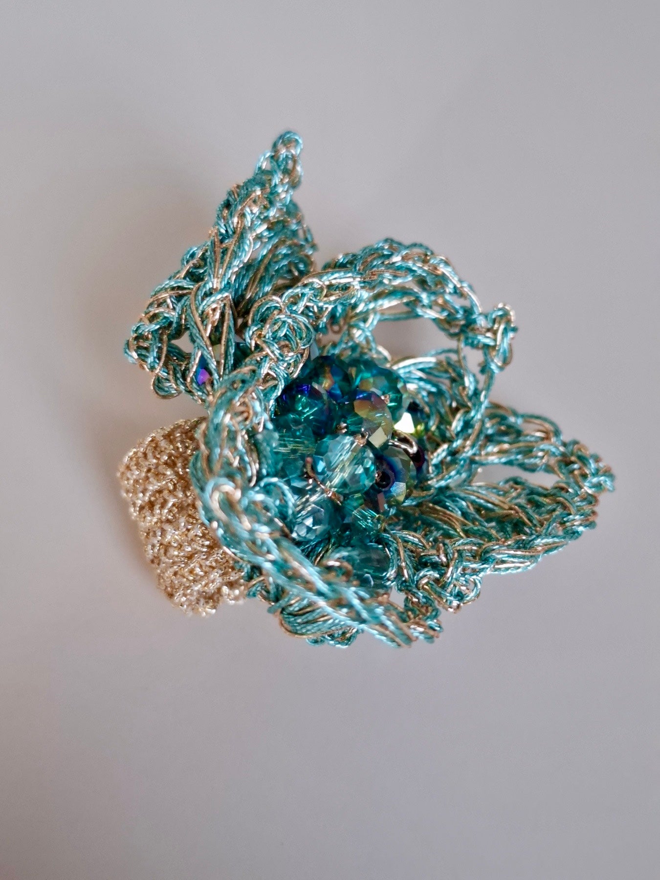 Add a unique touch of elegance to your look with this handcrafted crochet ring, made using luxurious Italian materials. Featuring shimmering jewelry micro yarn, delicate crystals, and fine silk in artistic color blends, each ring is a small wearable sculpture that catches the light beautifully.