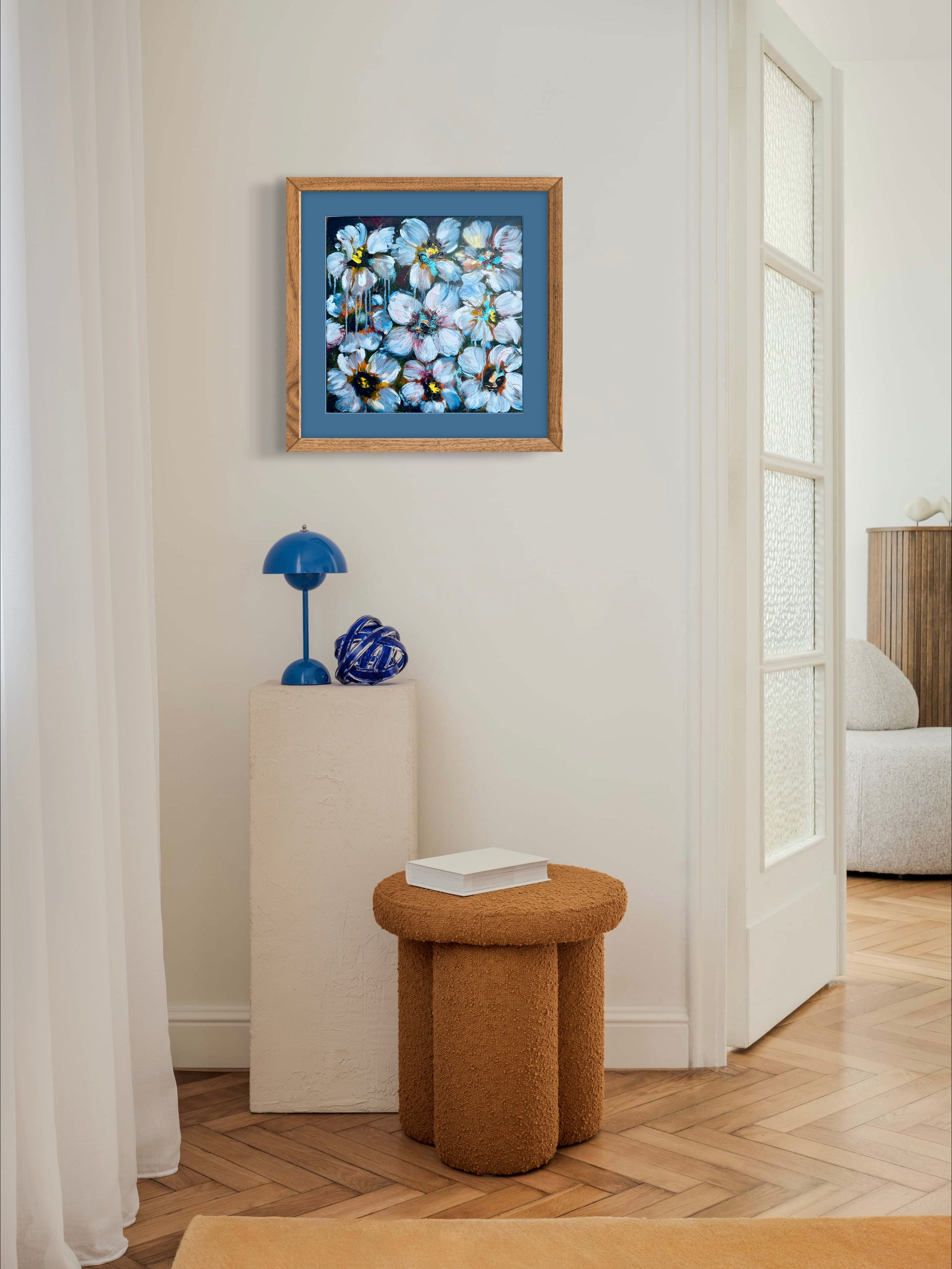 Each flower seems to participate in a quiet exchange, carrying its own emotion, rhythm, and story. Soft whites and blues unfold through layered brushstrokes, accented by subtle touches of turquoise and silvery shimmer, and earth tones background, creating a sense of intimacy and gentle connection.